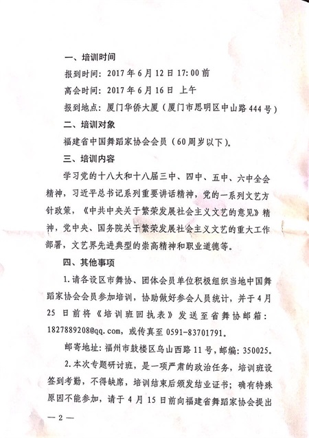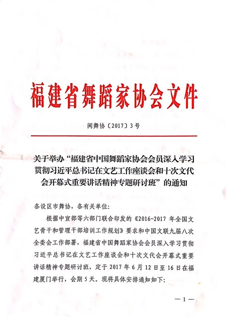 根据省舞协下发的《关于举办“福建省中国舞蹈家协会会员深入学习贯彻习近平总书记在文艺工作座谈会和十次文代会开幕式重要讲话精神专题研讨班”的通知》文件要求,市舞协将组织我市中国舞蹈家协会会员参加培训,现将通知转发告知并将参会人员统计工作通知如下: