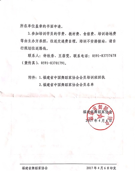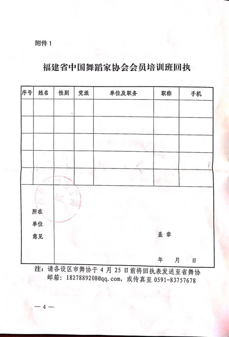 1、请参会人员于4月22日前将《培训班回执表》(通知内附件1)发送至市舞协邮箱:416502441@qq.com,便于市舞协汇总报送省舞协。