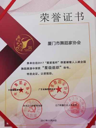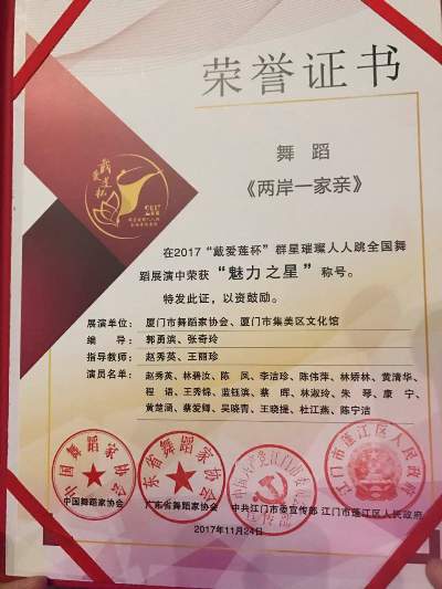 11月24日晚,由中国舞蹈家协会等单位共同主办的2017“戴爱莲杯”群星璀璨人人跳全国舞蹈展演活动在江门市圆满落下帷幕。市舞协组织的参演舞蹈队在39支展演队伍中脱颖而出,揽获多奖:舞蹈《两岸一家亲》荣获“魅力之星”称号;市舞协副秘书长张奇玲、会员郭勇滨荣获“魅力编导”称号;常务理事赵秀英、理事王丽珍荣获“魅力教师”称号;市舞协及集美区文化馆荣获“星级组织”称号。